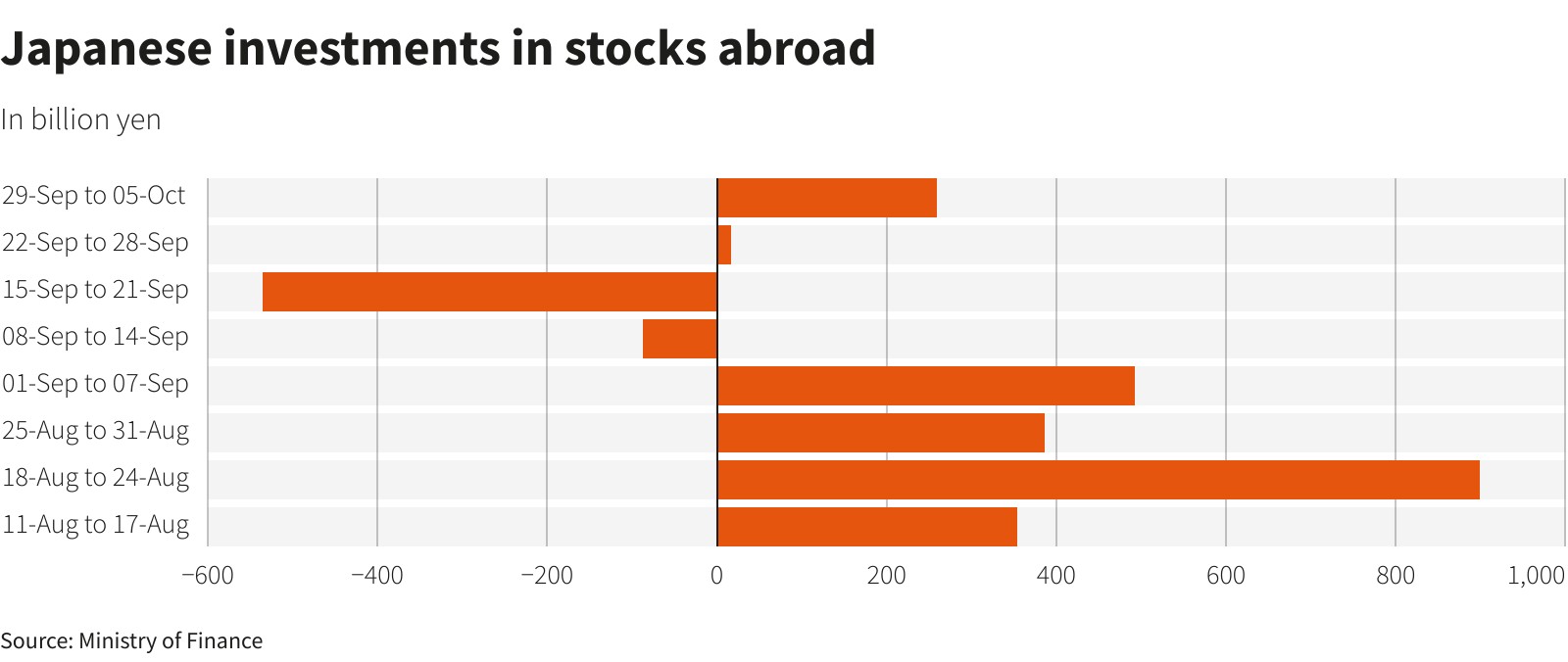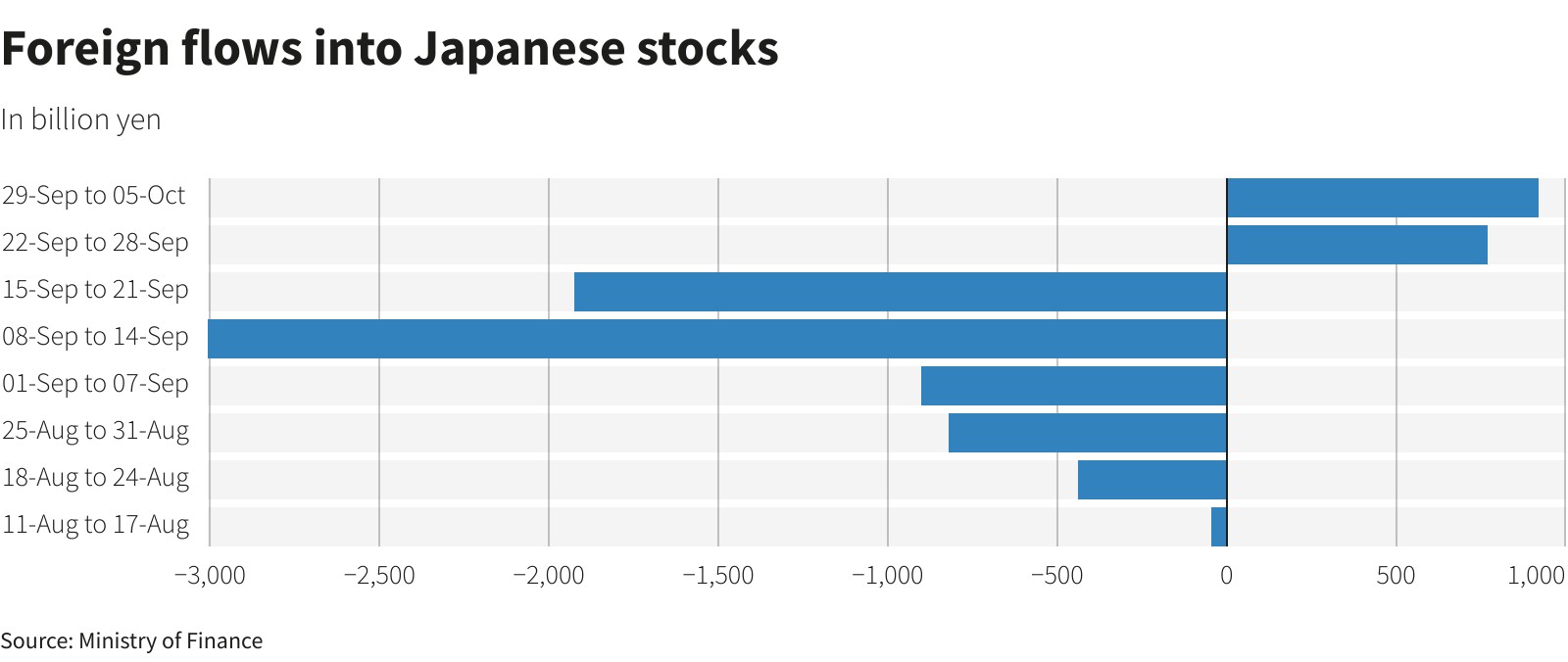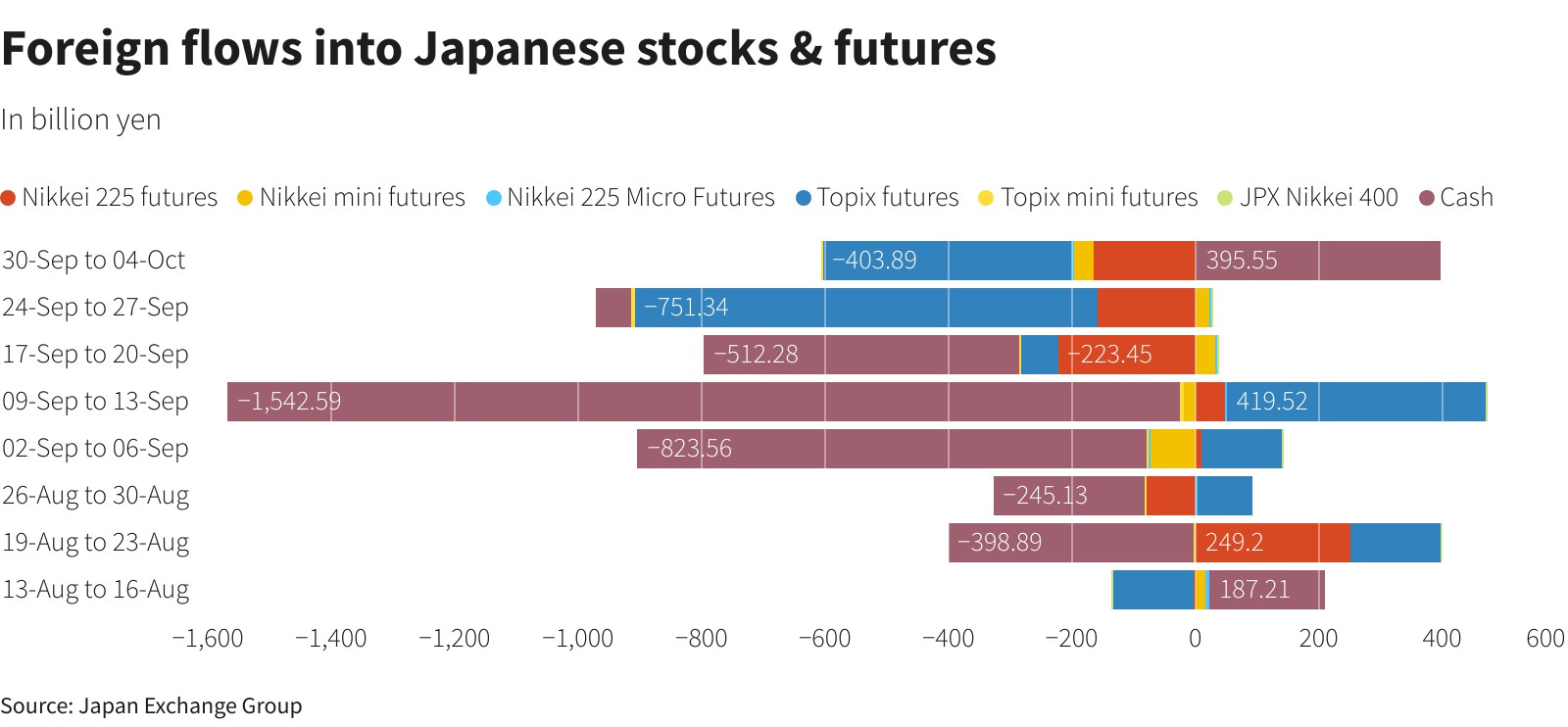 在截至10月5日的一周内,外国投资者增加了对日本股票的购买。日本财务省的数据显示,外国投资者在当周净买入价值9193亿日元(约合61.6亿美元)的日本股票,为4月13日以来最大的单周净买入规模。