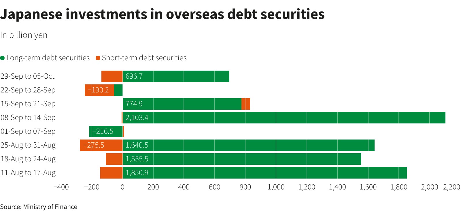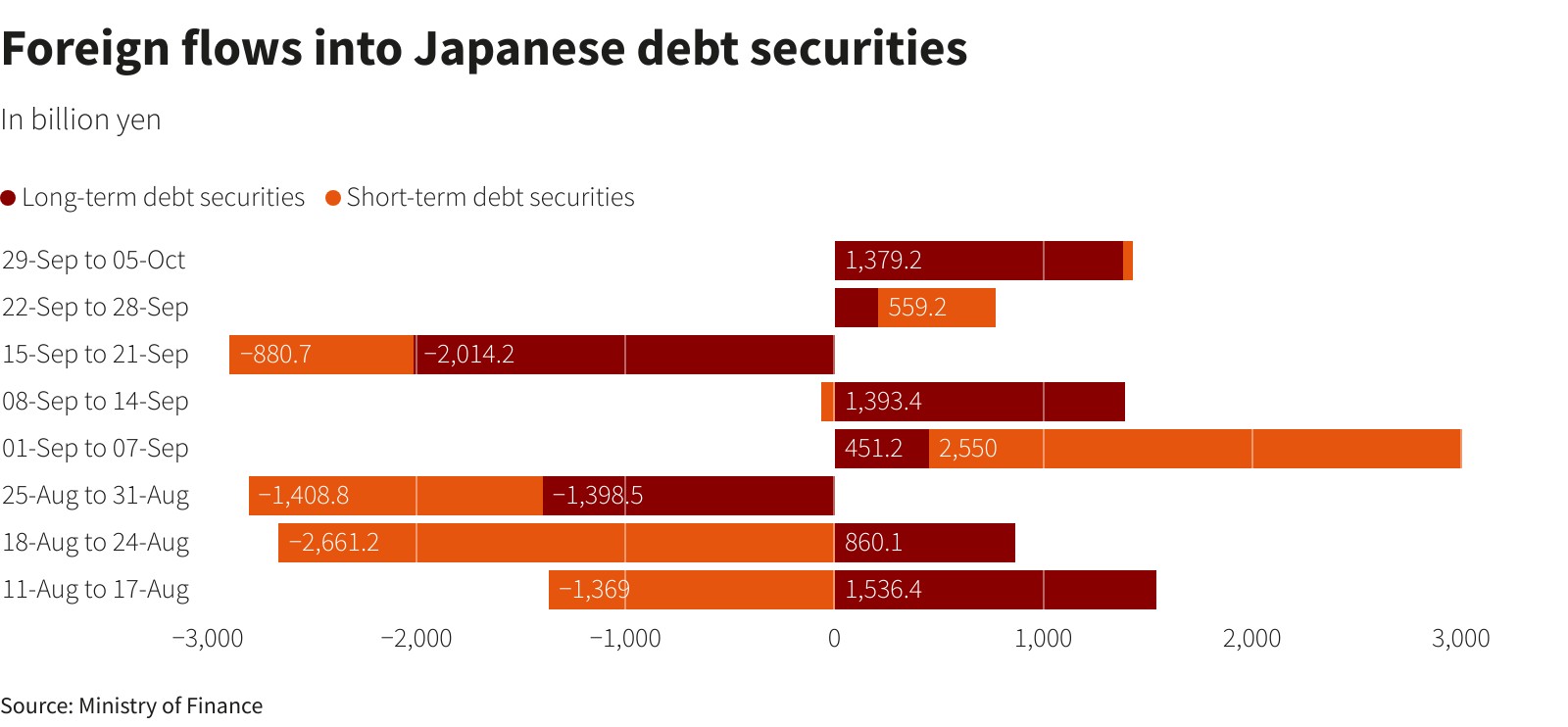 在日本债券市场,外国投资者净买入价值1.38万亿日元的长期债券,这是自9月14日以来最大的单周净买入规模。外国投资者还买入了约503亿日元的短期债券。